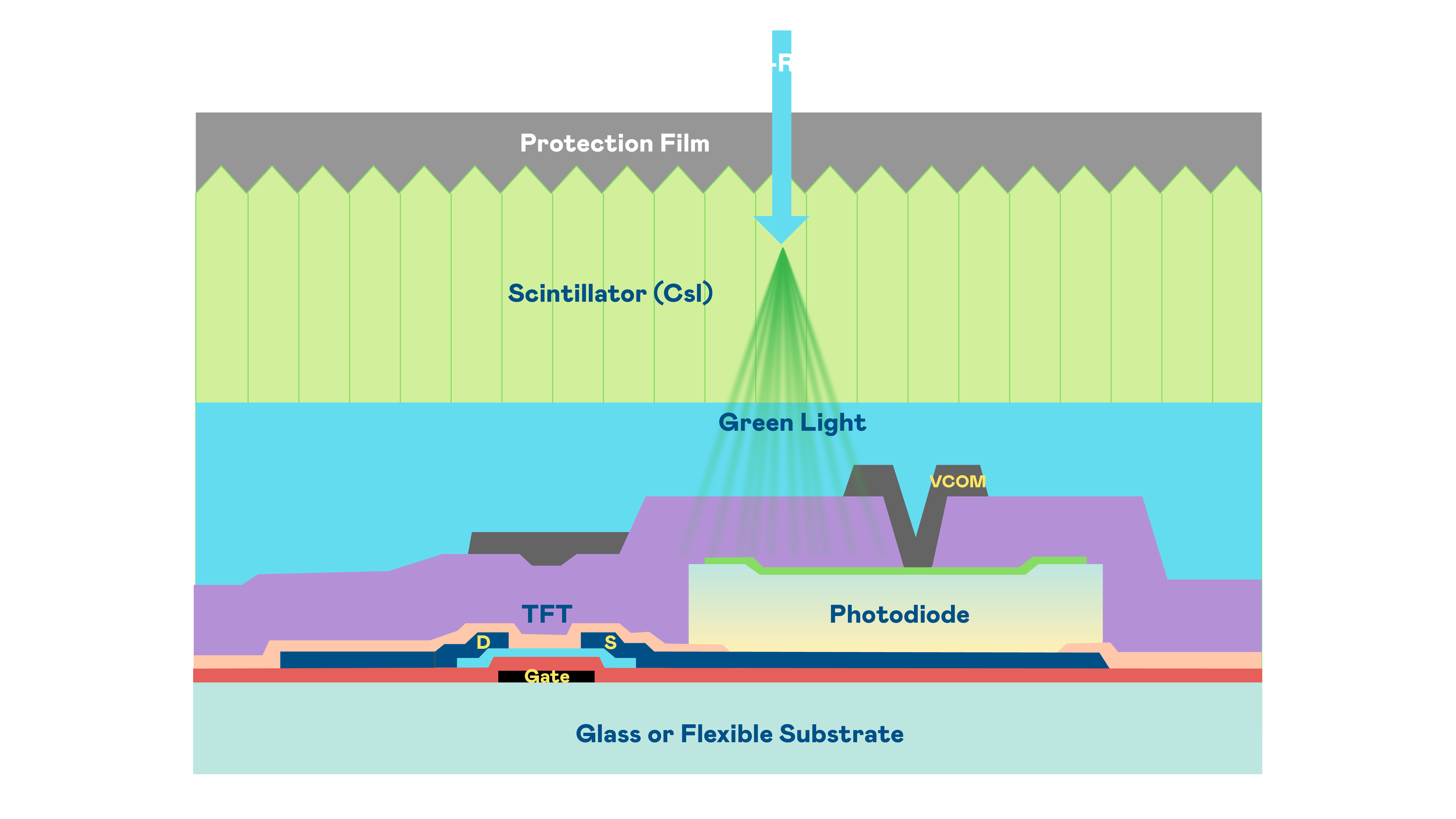 yd12399云顶集团的X光影像感測陣列使用薄膜電晶體 (TFT) 作為每個像素的讀取開關,搭配光電二極體(Photodiode)的光電轉換元件,用以感測X光影像訊號。
